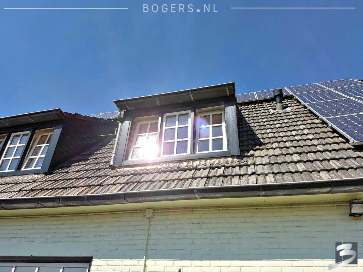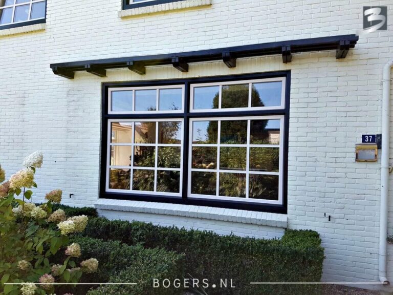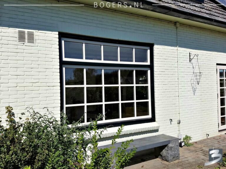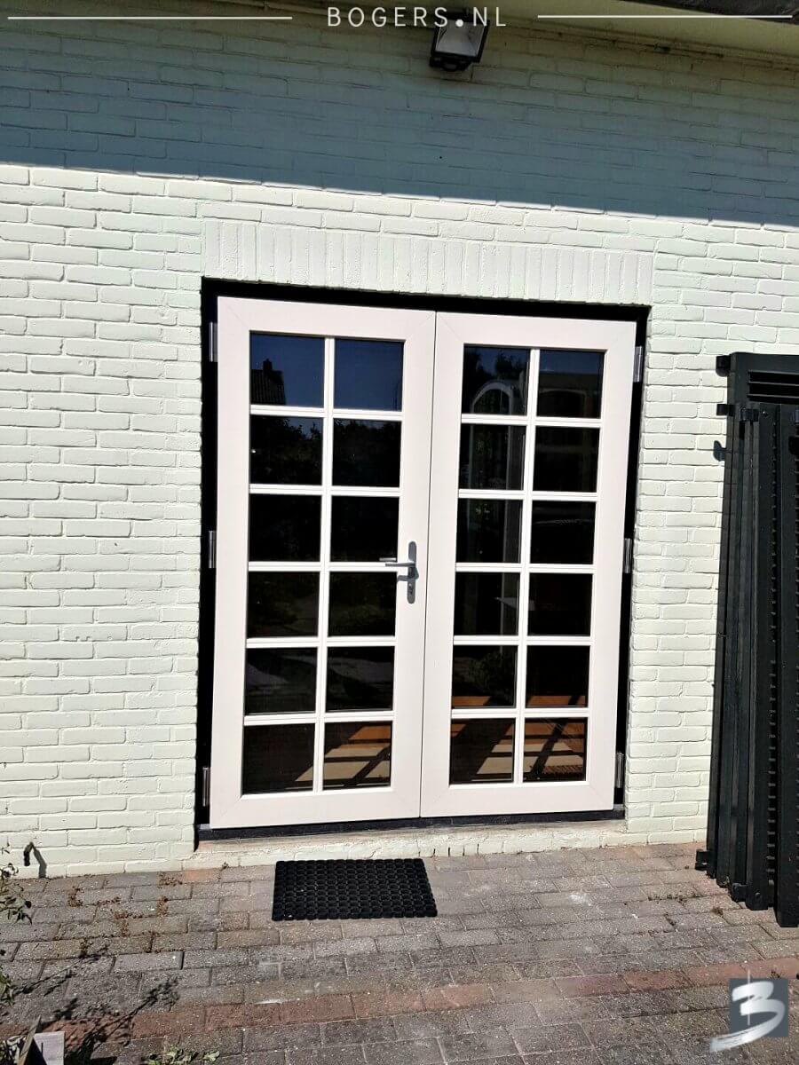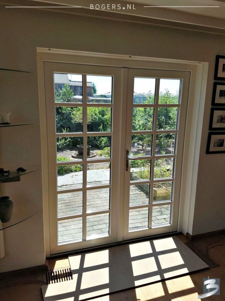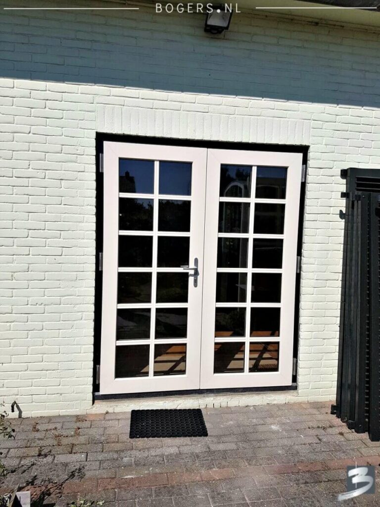Links & rechts naar buiten draaiende deuren. Kleur van de kozijnen binnen is houtnerf wit 9010 en buiten houtnerf monumenten groen 6009. We hebben helder isolatieglas HR++ geplaatst. Het glas is voorzien van roede, kleur: binnen wit/buiten crème wit.
