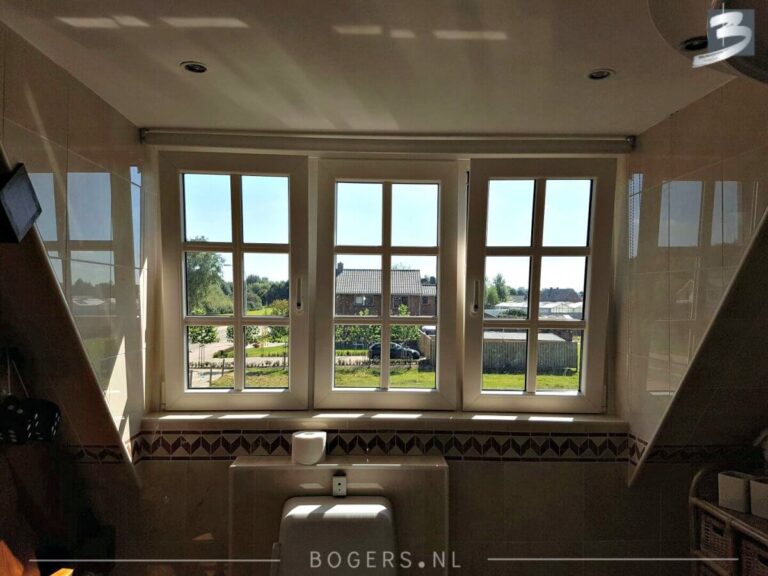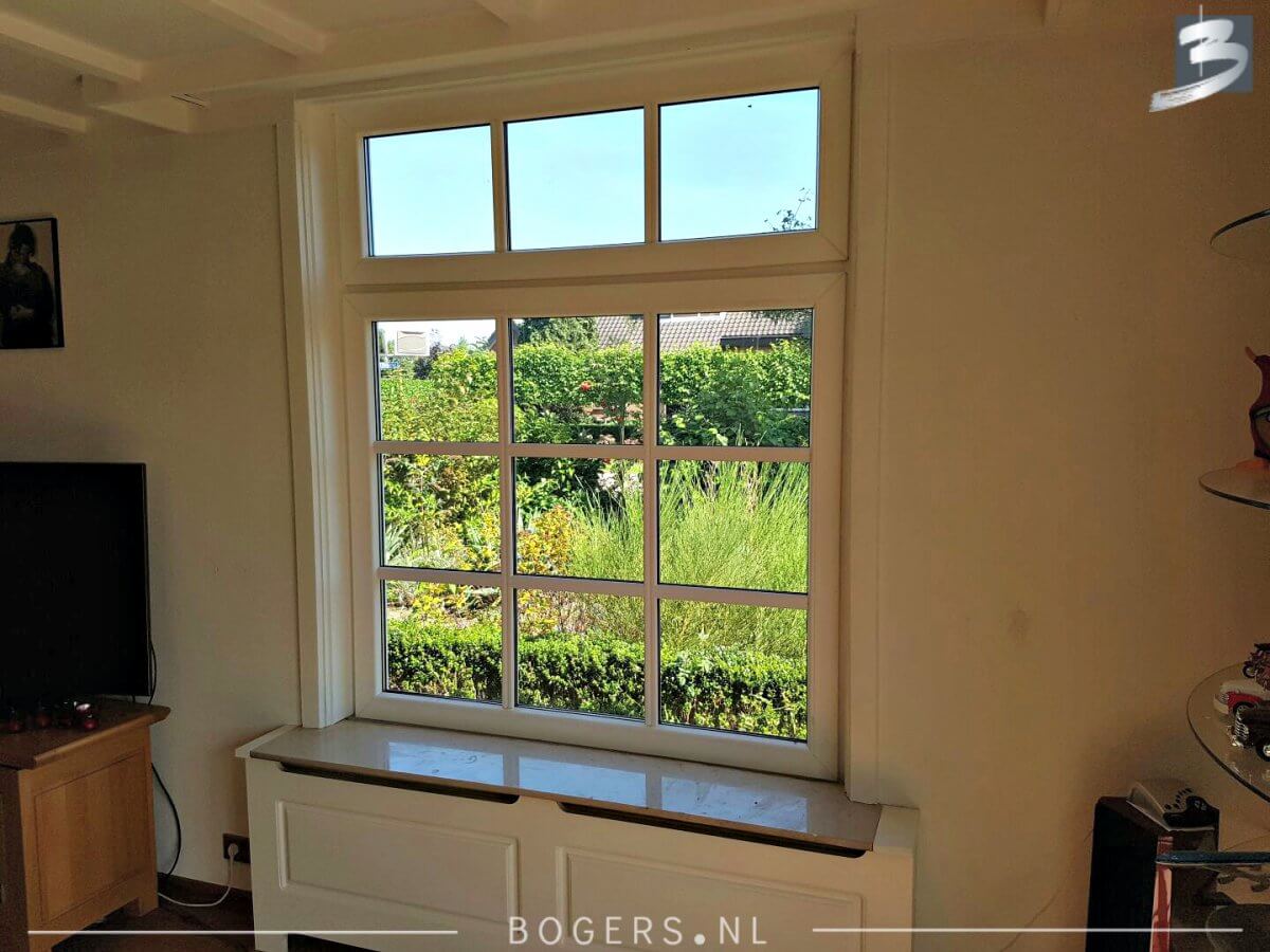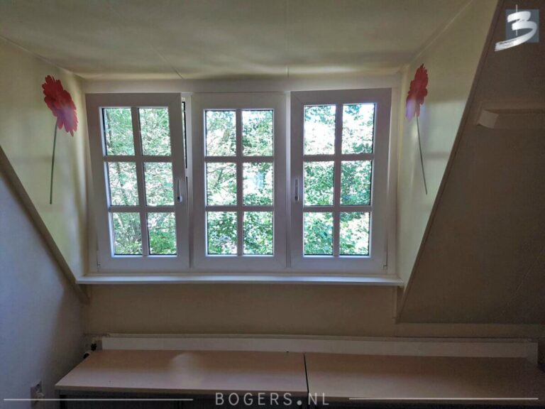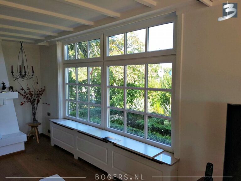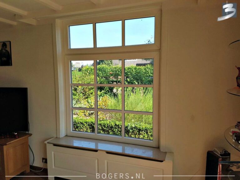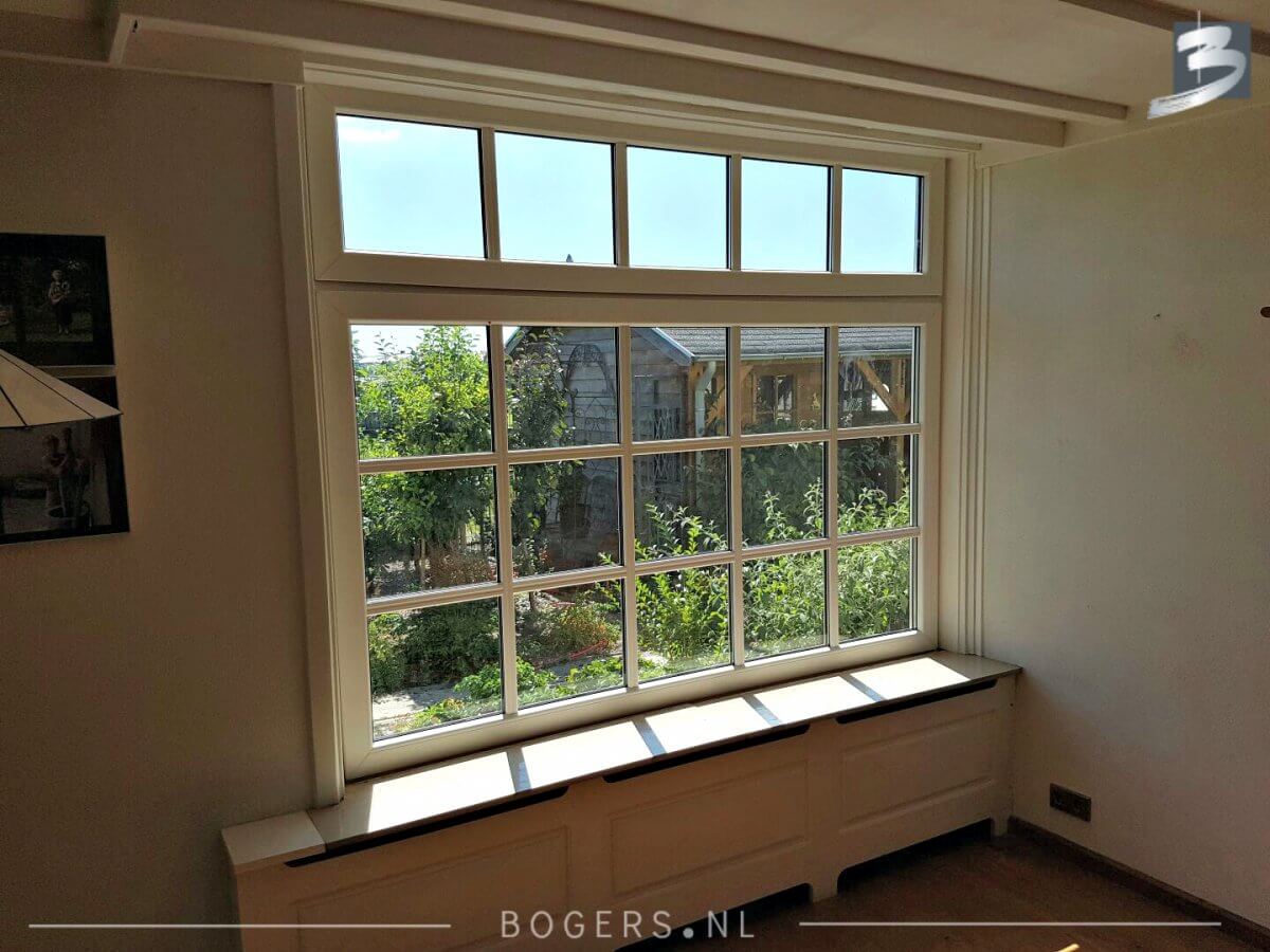 Bij alle kozijnen is er gekozen voor een Holland kunststof verdiepte profiel. De kleur van de kozijnen binnen is houtnerf wit 9010 en buiten houtnerf monumenten groen 6009. De kleur van de draaidelen binnen houtnerf wit 9010/ buiten houtnerf crème wit 9001. Met helder isolatieglas HR++. Het glas is voorzien van roede, kleur: binnen wit/buiten crème wit.
