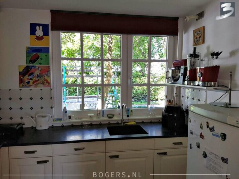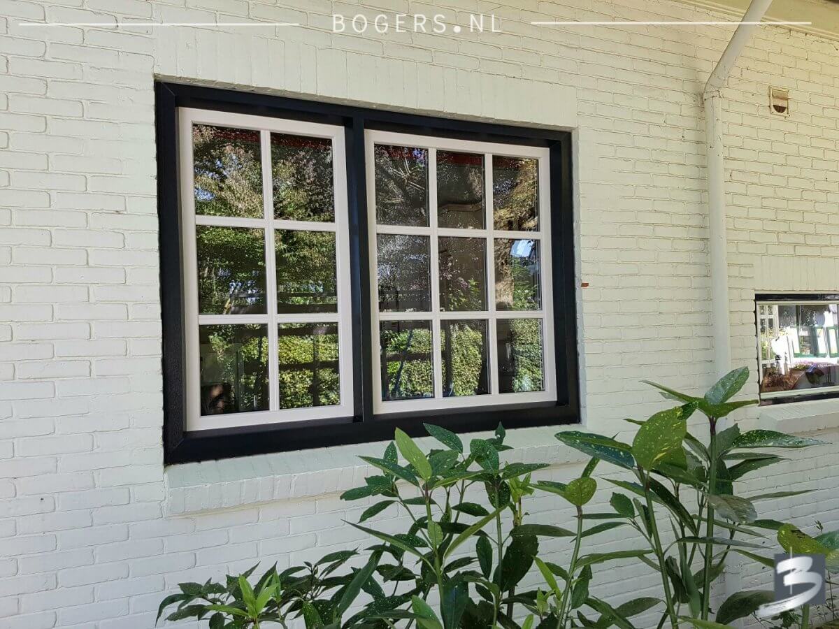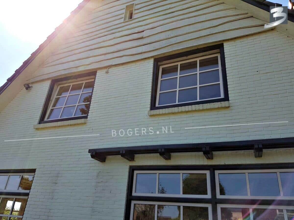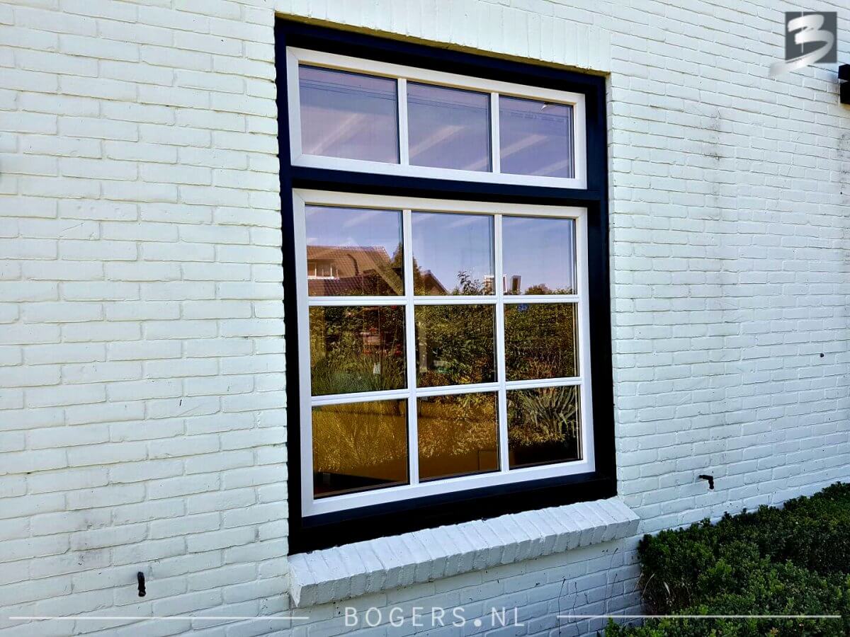 Bij alle kozijnen is er gekozen voor een Holland kunststof verdiepte profiel. De kleur van de kozijnen binnen is houtnerf wit 9010 en buiten houtnerf monumenten groen 6009. De kleur van de draaidelen binnen houtnerf wit 9010/ buiten houtnerf crème wit 9001. Met helder isolatieglas HR++. Het glas is voorzien van roede, kleur: binnen wit/buiten crème wit.